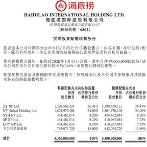 随后,张勇团队便开始了减持套现。5月7日,海底捞国际控股有限公司(下称海底捞)发布公告称,公司股东SP NP Ltd.及LHY NP Ltd.拟以每股33.2港元的价格配售4700万股股份,占公司已发行股本0.89%,两位股东分别套现价值约7.8亿港元。该配售计划将于2020年5月11日上午9时完成。
