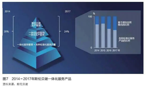斯伦贝谢一体化服务产品占总收入的比例从2014年的20%上升到2017年的24%(见图7),约从1/5上升到1/4。一体化服务产品收入中基于绩效合同模式(即第二层级和第三层级)的比例从2014年的22%上升到2017年的44%,3年几乎翻番。