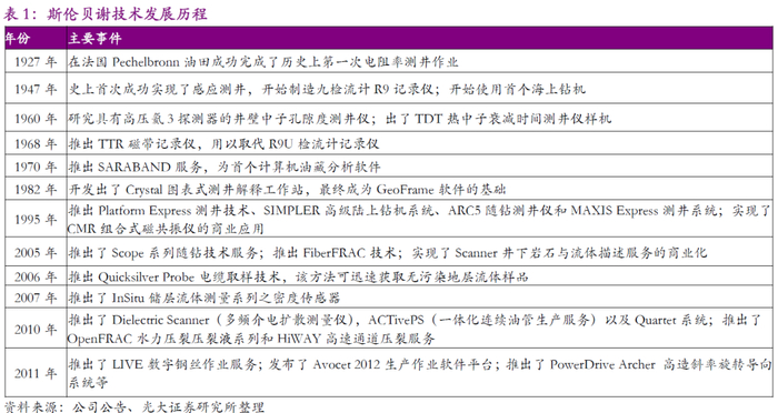 1952年,斯伦贝谢收购Forex钻机公司50%的股份,拓展了钻井服务及设备;1960年,斯伦贝谢与陶氏化学在北美成立了道威尔(Dowell)固井公司(持50%股份),拓展固井、压裂等服务。
