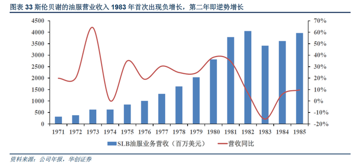 该所成立的第二年,油服营业收入增速便由负转正:,1984年,尽管原油均价同比下跌了2.6%,但是公司总营收同比增长8%,净利润同比增长9%。
