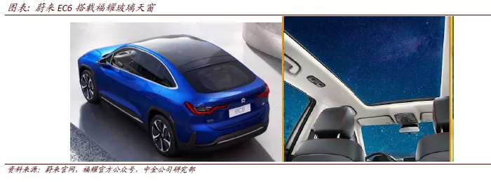 大尺寸天窗除了面积增大之外,还能够创造更多对天窗玻璃功能性的需求,比如隔热、防晒等,能够从单车配套面积和单位配套价值量两方面带来单车价值量的提升。比如蔚来全新EC6,搭载福耀玻璃天窗,尺寸为2.1平方米,在带来超大尺寸视觉体验的同时,还是全国首个集成镀膜与Low-E技术的玻璃天窗,在防晒隔热、隔绝太阳能辐射等方面具有叠加效果,且拥有较高的可见光透射比,在玻璃尺寸和集成功能性方面实现双升级,除了面积比传统天窗翻倍以上之外,同基础的钢化玻璃、夹层玻璃、或者单一Low-E玻璃相比,价值量有较大的提高。