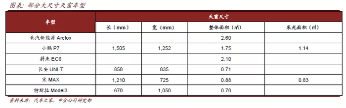 全景天窗由于其透光性强,采光效果佳,能够从视觉上放大车内空间,且能够无遮挡享受上空美景等特点,受到客户青睐,配套车型渗透率近年来大幅提升。从尺寸上来看,全景天窗尺寸可以比传统小天窗大近一倍,带来了单车玻璃配套面积的增加,而单车全景天窗的尺寸仍有继续提高的趋势,从全景“天窗”升级为全景“天幕”,天幕面积基本大于1平方米,甚至有车型超过2平方米,为全景天窗的两倍以上,为传统前天窗的4-5倍。小鹏P7、蔚来EC6、北汽新能源Arcfox天窗尺寸分别高达1.75平方米、2.1平方米、2.6平方米,同时新上市或即将上市的长安UNI-T、宋MAX、特斯拉model 3的全景天窗面积也均向1平方米靠近,尺寸升级趋势已较为明显。