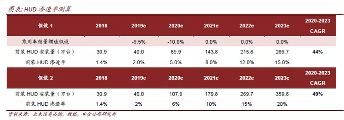 我们参考LED渗透率提升速度,分别假设HUD渗透率将在2023年达到15%和20%,且按照2021-2023年乘用车销量均与2020年持平极端假设预测,我国HUD安装量未来三年复合增长率有望超过40%,且未来随着AR-HUD量产后,渗透率上升空间有望再扩容。