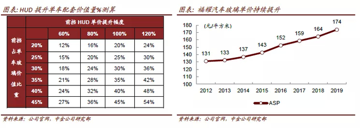 由于前挡玻璃占整车玻璃面积比重较大,以及拥有较多集成功能(可加热、隔热、隔音等),我们预测前挡玻璃占整车玻璃配套价值量30%-40%之间,小天窗或无天窗车型占比或更高。我们假设除了前挡玻璃外,侧窗、后挡及天窗玻璃价值量不变,按照HUD对前挡玻璃价格提升幅度60%/80%/100%/120%,以及前挡占单车玻璃价值比重20%到45%测算,整体单车配套价值量有望提升12%到54%不等,福耀汽车玻璃单价已呈现逐年提升的趋势,HUD渗透率提高或能提供ASP持续增长驱动。