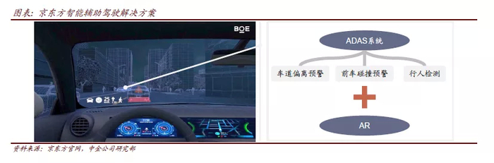 目前,京东方掌握了业内领先的智能辅助驾驶解决方案,包括双层显示AR-HUD(增强现实+抬头显示)、ADAS(高级驾驶辅助系统)及驾驶员疲劳检测系统等。其中,ADAS系统的车道偏离预警、前车碰撞预警、以及行人检测三大功能,能够结合AR技术集成到HUD中,并连同车速、实景导航等信息投射到前挡风玻璃上,以便驾驶员更直观地获取行驶状态、导航信息,并及时采取措施,消除事故隐患。