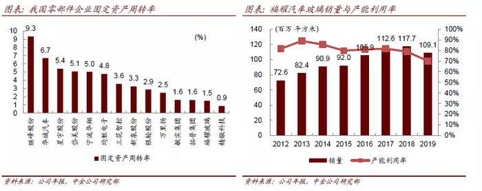 公司固定资产周转率在我国零部件行业中排名偏低,在行业中资产较重,规模效应较为明显,产能利用率的提升将使公司释放较大盈利弹性。公司由于在苏州的400万套汽车玻璃新建产能于2019年及2020年陆续投产,按照2019年投产200万套、2020年投产200万套产能计算,汽车玻璃产能去年及今年分别扩张了5.5%和5.2%,即如果不考虑销量变动,今年公司汽车玻璃产能利用率理论将比19年下滑约5%,如果考虑国内外卫生事件对销量影响,我们判断产能利用率或将进一步收缩,达到2012年以来历史新低,使折旧摊销占比加大。