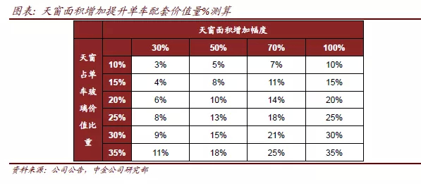 我们假设天窗价值量同面积同比例增加,按照其单车玻璃价值量比重10-35%的区间测算,仅考虑天窗面积玻璃增加30%/50%/70%/100%时,单车价值量或提高3%至35%,如果考虑到天窗增加更多隔热、防晒、氛围灯等集成功能甚至升级为调光玻璃等智能化玻璃,或对单车价值量提升幅度有较大加成作用。