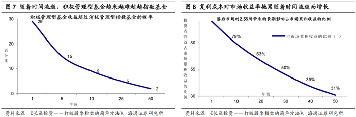 相较而言,指数基金成本更低,截止7月31日,美股市场上的581只指数型基金,基金经理公布费用率均值为0.27%,销售佣金为0.08%,其中有71只需要缴纳申购费,平均为5.04%。高昂的成本导致积极型管理基金随着时间流逝越来越难战胜指数性基金,博格做了个蒙特卡洛模拟,假设指数基金年均成本率为0.25%,积极管理型基金的年均成本率为2%,模拟结果显示,按1年期计算,29%的积极管理型基金收益率超过指数基金,5年期为15%,10年期为9%,25年期为5%,50年之后,仅有2%的积极管理型基金能超过指数型基金。