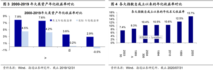回顾A股三十年,股票长期收益率更高。分析中国大类资产表现,股市以万得全A、房地产以全国商品房房价(全国房地产销售额/销售面积)、债市以10年期银行间国债到期收益率、大宗商品以CRB指数作为衡量基准。考虑数据的齐全性,分析2000-2019年期间我国大类资产的收益率,房地产、股市、债市、大宗商品名义年化收益率分别为7.9%、7.6%、3.6%、2.9%,扣除通胀后实际年化收益率分别为4.5%、4.2%、0.2%、-0.5%。进一步从更长期角度分析A股主要指数的表现,统计各指数自成立以来的名义年化收益率,中小板指(2005年以来)为15.7%,上证综指(1990年以来)为12.5%,深证成指(1994年以来)为10.5%,沪深300(2004年以来)为10.4%,创业板指(2010年以来)为10.6%,万得全A(1999年以来)为8.3%,上证50(2003年以来)为7.4%。