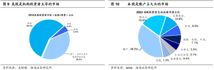 总之,在美股市场上,投资者结构中机构投资者占多数,截止2019年美股机构投资者持股市值占比达到56.9%,占多数的机构投资者收益率表现接近同期指数表现,但是这些共同基金受累于成本高企,从而表现难以跑赢指数基金。