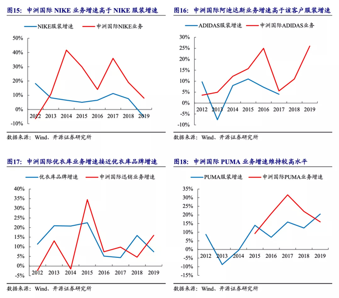 耐克、阿迪达斯、彪马、优衣库四大优质客户的业务快速增长,由此成为了申洲国际长期发展的持续推动力。2014-2019年,申洲国际前四大客户的收入占比基本稳定在80%左右。而该四大客户自身业务也一直保持着较快增长。耐克和阿迪达斯是运动服饰行业中稳定保持前二的龙头品牌。彪马在细分市场也拥有较为强劲的竞争实力。优衣库则是世界知名的休闲服饰品牌。整体看,这四个品牌自身的服装业务增速在2014-2019年基本处于10%以上,从而为申洲国际发展提供了持续推动力。