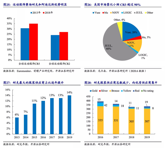 而下游市场良好的竞争格局,则有利于申洲国际、思摩尔国际等龙头代工厂的发展:①以耐克为例,耐克最大的服装供应商的订单占比逐年提升,由2014年的7%提升至2019年的14%,且其服装供应商总数有显著下降,向更优质的Bronze级别集中,而耐克的目标是在2020年拥有100%Bronze及更高级别的工厂。②对于雾化小烟市场,由于JUUL、Vuse和NJOY三个品牌基本垄断市场。并且三个品牌的供应体系已经基本稳定,其他代工厂商新进难度较高。