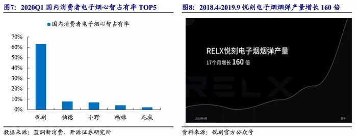 依靠资金优势和FEELM雾化芯技术,悦刻正处于加速扩张期。2018年4月至2019年9月,悦刻电子烟烟弹产量增长超过160倍。根据蓝洞新消费,2020Q1悦刻在国内市场一家独大,在消费者中的心智占有率超过60%。2019年9月,悦刻启动美国PMTA申请项目,预计将于2021年底提交申请,耗资预计达1.5亿元。若PMTA申请成功,悦刻品牌力将进一步提升,并有望逐步打开海外市场。