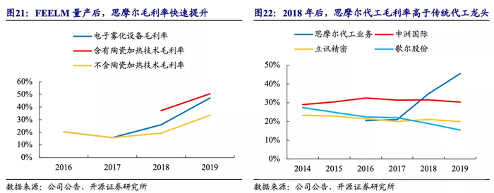 3)从毛利率上,我们也可以看出FEELM技术的高议价权。在FEELM雾化芯产品量产前的2016-2017年,思摩尔ToB代工业务毛利率处于20%左右,与立讯精密、歌尔股份等传统电子代工企业非常接近。2018年,FEELM雾化芯实现规模化量产,思摩尔代工业务的毛利率由此快速提升。2019年,公司ToB端电子雾化设备业务中含有和不含陶瓷加热技术的产品毛利率分别为50.3%和33.5%,整体代工业务毛利率提升至45.5%,显著高于立讯精密等传统电子代工企业,并超过申洲国际。
