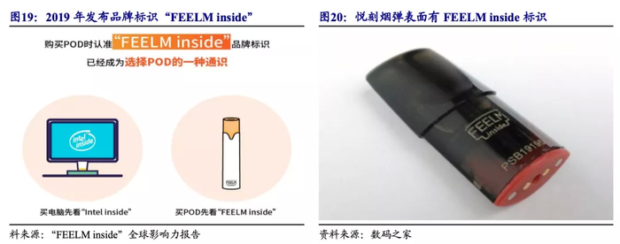 2)2019年,FEELM发布了品牌标识“FEELM inside”。包括悦刻在内的烟弹上已经附有了FEELM inside标识,未来FEELM与国内外合作生产的雾化设备上都会逐步带有该标识。