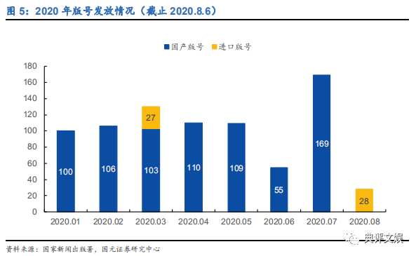 (3)版号情况:2020 年 7 月共发放版号 169 个。8 月 6 日发放进口游戏版号 28 款。腾讯(00700)《使命召唤手游》、网易《哈利波特:魔法觉醒》、字节代理《航海王热血航线》、B 站(BILI.US)《魔法少女小圆》、心动网络《人类跌落梦境》、游族《星球大战》、电魂网络《巅峰战场》等多个重点产品获得版号。