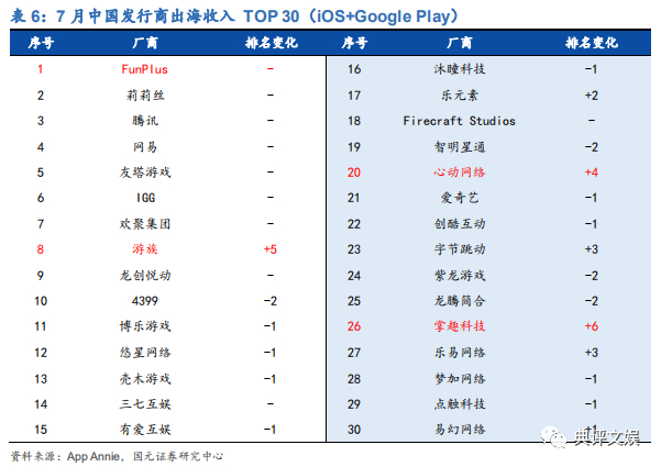 出海厂商方面,7 月出海发行商前七位置保持不变,FunPlus 凭借《阿瓦隆之王:龙之战役》、《火枪纪元》、《State of Survival》等头部产品的稳定表现,稳居榜单第一。游族三国题材卡牌游戏《少年三国志 2》在韩国上线,以及在日本发行的二次元卡牌新作《红:伊甸园的骄傲》的优异表现排名上升 5 位,来到第 8 名。港澳台服《明日方舟》收入表现亮眼,助力代理商心动网络排名上升 4 位,位列第 20 名。掌趣科技旗下《一拳超人:最强之男》延续在东南亚地区的良好表现,相对上月排名上升 6 位,位列第 26 名。