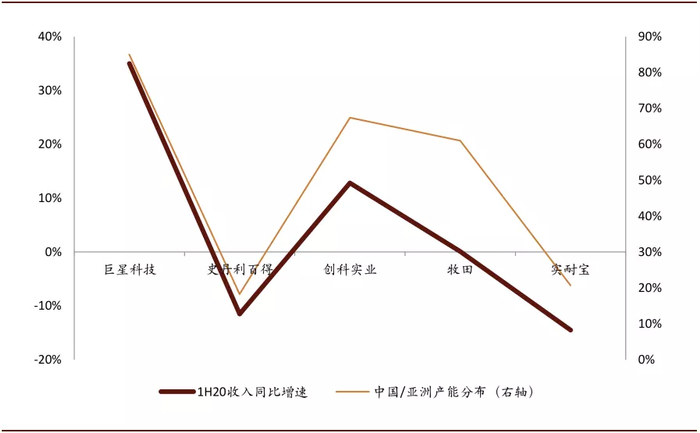 图表:1H20全球工具企业收入增速与中国/亚洲产能比重高度相关