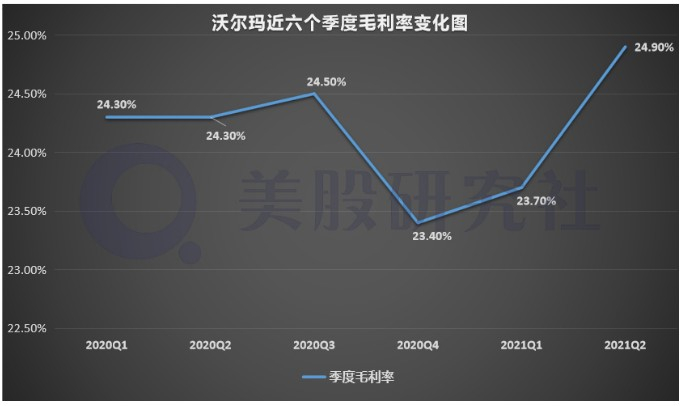 这种电商业务销售额强劲,但毛利率欠佳的局面已持续一段时间。财报中二季度毛利率为24.9%,从近六个季度的毛利率水平来看,沃尔玛的毛利率表现整体呈现低迷,原因在于运输成本和电商业务投资支出的增加。
