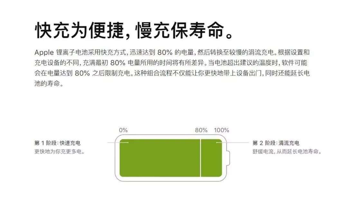 以3000mAh的iPhone 11为例,其15分钟的充电速度为30%,半小时达到50%,落后于主流水平。并且苹果在充电截止阶段(80%—100%)的速度极慢,需要半个小时以上才能充满,对此,苹果曾经以“电池健康”为由进行解释,并在后续的iOS 13更新中加入了“智能充电”选项,进一步降低涓流充电*的功率。