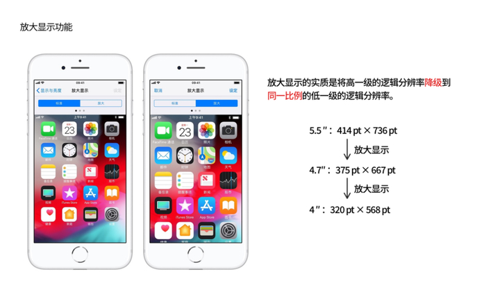 具体来说,放大显示的实质是将高一级的逻辑分辨率降级到同一比例的低一级的逻辑分辨率,比如当放大显示模式开启时, 5.5 寸屏幕可以使用 4.7 寸屏幕的逻辑分辨率来显示内容,4.7 寸屏幕可以使用 4 寸屏幕的逻辑分辨率来显示内容。将低一级的逻辑分辨率放到更大的屏幕上展示,自然会有放大效果,适配了大屏幕 iPhone 的 app 自然也适配了更小屏幕的 iPhone,这样就可以完全没有额外的设计和开发成本。