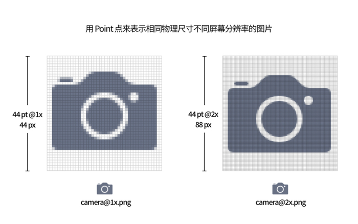但我们知道,无论是不是 Retina 屏幕,这个照相机的图片在 3.5 寸屏幕上的实际显示大小是相同的,而如果用像素去表示的话,它们的数字却是不同的,这会带来很多沟通和操作成本,需要一种更好的方法去表示这个照相机图片的尺寸,「Point 点」的概念应运而生。