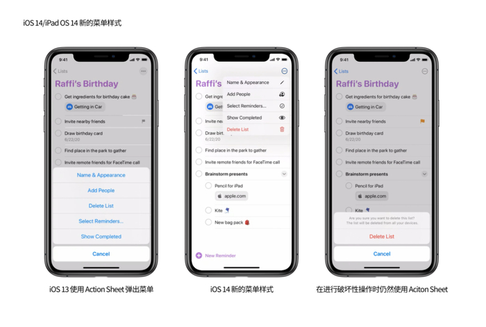 在 iOS 14/iPadOS 14 中新增了一种菜单样式,当用户点击按钮时,新的菜单会直接显示在菜单旁边,而不再是使用以前的 Action Sheet(从屏幕底部弹出的菜单选项)样式,例如下图中的「提醒事项」app 。新的菜单样式可以让用户在较大的屏幕上更好地理解菜单选项和按钮之间的关系,同时可以不需要大幅度移动手指就可以完成操作。