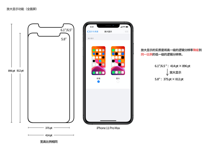 前文提到,从 iPhone 6 开始,iOS 在部分机型中新增了「放大显示」功能,放大显示的实质是将高一级的逻辑分辨率降级到同一比例的低一级的逻辑分辨率。在全面屏 iPhone 中,6.1 寸、6.5 寸的 iPhone 具备放大显示的这个条件,所以这两种尺寸的 iPhone 在系统中同样可以开启放大显示模式;但 5.8 寸的 iPhone 不存在比它还要低一级的同一比例的逻辑分辨率,所以 5.8 寸的 iPhone X、iPhone Xs、iPhone 11 Pro 一直没有放大显示功能。