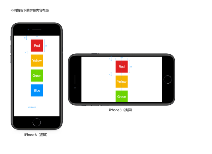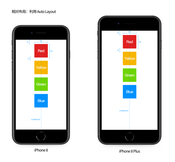 当把上面确定的每个方块的绝对布局参数放到 iPhone 8 Plus 的屏幕上显示时,我们就会发现四个方块在屏幕上显示的位置有些奇怪。仔细思考下,在 iPhone 8 的屏幕上四个方块的位置坐标之所以可以确定下来,是因为我们想要这四个方块在屏幕水平方向上是居中对齐的。当移动到 iPhone 8 Plus 的屏幕上,屏幕的逻辑分辨率发生了变化,屏幕变宽了,如果还是按照之前的位置参数放置四个方块,其自然不会在屏幕水平方向上处于居中对齐的位置了。