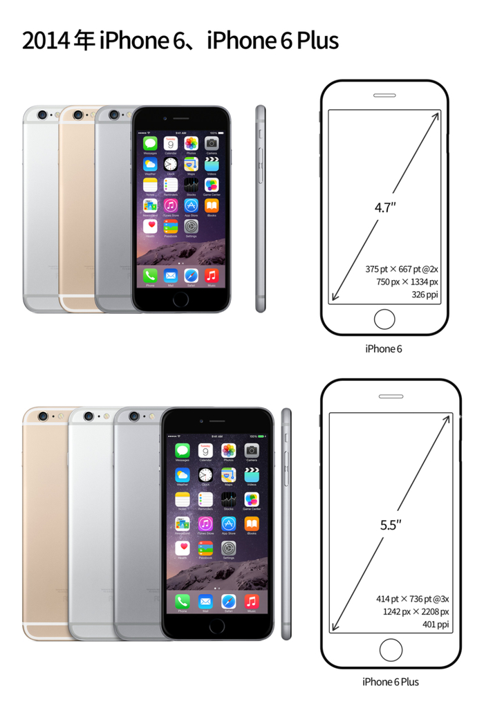 2014 年 iPhone 6 和 iPhone 6 Plus 同时发布,iPhone 的屏幕尺寸再次发生重大变化,根据不同人群的使用需求和偏好,由之前的一种主流尺寸衍变成了一大一小两种尺寸。小屏旗舰 iPhone 6 采用 4.7 寸屏幕,屏幕逻辑分辨率为 375×667pt,比例因子为 @2x,PPI 为 326;大屏旗舰 iPhone 6 Plus 采用 5.5 寸屏幕,屏幕逻辑分辨率为 414×736pt,比例因子首次采用 @3x,PPI 为 401。