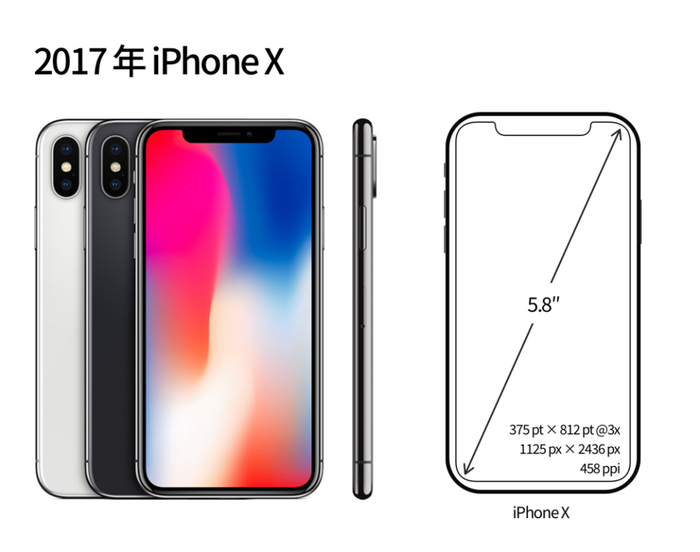 2017 年 iPhone 转向全面屏时代,搭载 iOS 11、配有 5.8 寸屏幕的 iPhone X 发布,屏幕分辨率为 1125×2436px,PPI 达到 458,屏幕尺寸和屏幕分辨率都发生了重大变化,而且屏幕由以前的 LCD 屏改为了 OLED 屏。由于从非全面屏到全面屏的进化,iPhone 去除了 Home 键,由软件层面的 Home Indicator 代替;去除了 Touch ID,由刘海内的Face ID 代替;屏幕的四角也变成了圆角,整块屏幕不再是规则的矩形。