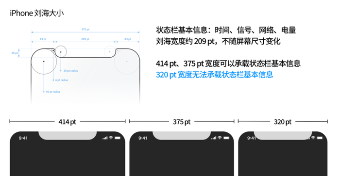 全面屏 iPhone 的刘海中包含的物理元器件并不随 iPhone 的屏幕尺寸所变化,根据网上找到的资料,刘海的宽度大概为 209pt。在目前放出的 iOS 14 Beta 版本中,刘海附近的状态栏显示区域(包含基本的时间、信号、网络和电量信息)并没有发生设计上的改变,而当把现有的状态栏放到 320pt 宽度的 iPhone 上时,会发现其无法承载现有的状态栏信息,那这是否可以推测 5.4 寸的 iPhone 12 抑或是整个 iPhone 12 系列的刘海会变得更窄更小呢?