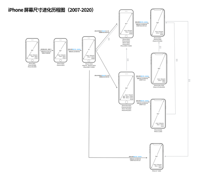 在这 13 年间 iPhone 的屏幕尺寸是怎样一步步进化到此的?基于软硬一体的设计,屏幕物理尺寸的变化背后包含着怎样的进化规律?这些变化对与我们朝夕相处的手机 app 又产生了什么影响?根据已有的进化规律,我们是否可以展望未来的 iPhone 还会走向何方?基于 iOS 14 Beta 中发现的新线索,我们又可以推断出 iPhone 12 的哪些更多信息呢?本文就来说道说道。