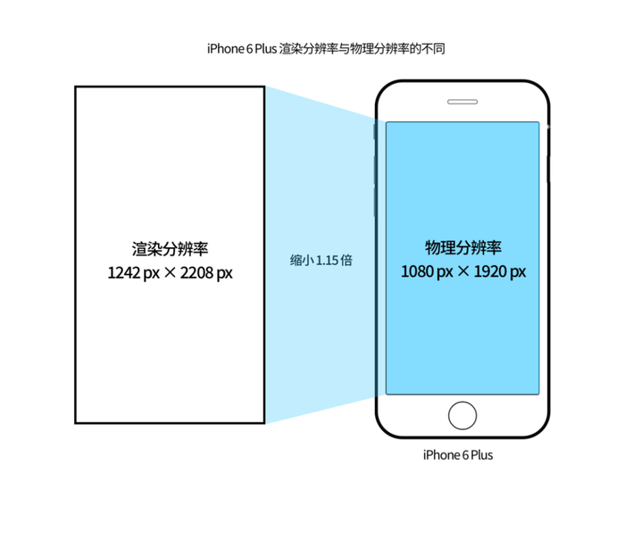 这次的 iPhone 6 Plus 有一点比较特殊的地方,其渲染分辨率为 1242×2208px,但其设备真实的屏幕物理分辨率只有 1080×1920px,也即处理器渲染的图像分辨率比屏幕自身物理分辨率更高,在实际显示时相当于将渲染的图像缩小了 1.15 倍。图像在屏幕上显示时如果能做到像素一对一显示效果才能最完美,但 Apple 在此机型上作出了妥协,究其原因可能是因为当时 1080p 的屏幕的广泛使用可以削减手机成本、加快出货日期,同时也可以有更好的续航能力。
