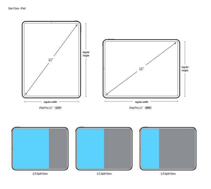 不同屏幕尺寸、不同屏幕方向的 iPad 也同样有 Size Class 的定义,如 iPad Pro 11 寸在竖屏时是「regular width,regular height」,在横屏时也是「regular width,regular height」。特别的,从 iOS 9 开始,iPad 上的 app 支持以 Slide Over 侧拉或者 Split View 分屏浏览的形式显示,在这些使用场景中,它们也被定义了 Size Class。