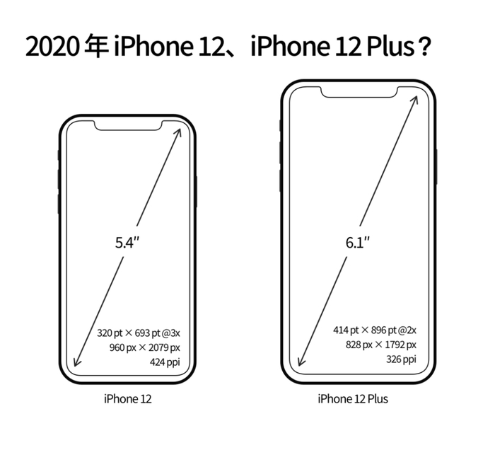 小屏旗舰 iPhone 12 配备 5.4 寸屏幕,屏幕渲染分辨率为 960×2079px,PPI 约为 424,逻辑分辨率为 320×693pt @3x;而大尺寸的 iPhone 12 Plus 仍然保持 6.1 寸屏幕,分辨率等与之前的 iPhone XR、iPhone 11 保持一致。
