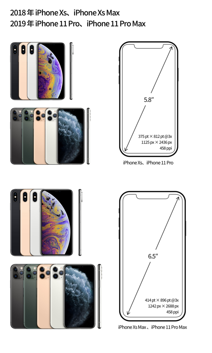 2018 年 5.8 寸的 iPhone Xs 发布,与 iPhone X 的屏幕保持一致,同时全面屏 iPhone 家族新增了 6.5 寸的 iPhone Xs Max,屏幕分辨率为 1242×2688px,PPI 为 458。2019 年 5.8 寸的 iPhone 11 Pro 和 6.5 寸的 iPhone 11 Pro Max 发布,与上一代的屏幕保持一致。