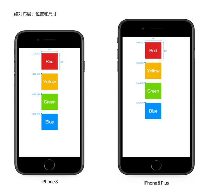 例如下图中的这个例子,在 iPhone 8 上有一个 app,app 的界面中展示有四个不同颜色的方块。按照绝对布局的方法来确定四个方块的位置和尺寸: