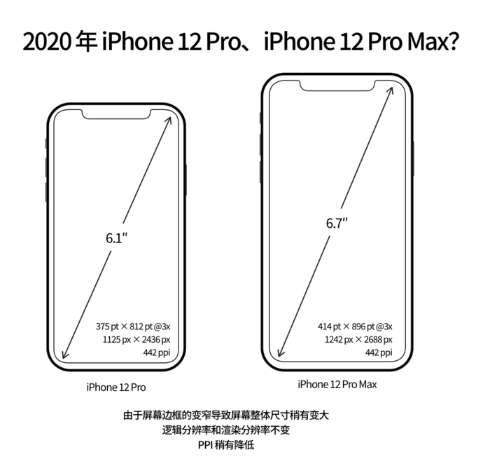 根据之前 iPhone 屏幕逻辑分辨率的进化规律,我认为 Apple 对于逻辑分辨率的改变是比较谨慎的,因为新的逻辑分辨率对设计师和开发者就意味着新的设计、适配和开发工作,iPhone 的屏幕尺寸就会更加碎片化,所以如果 iPhone 12 Pro 的尺寸真的是 6.1 寸和 6.7 寸,猜测屏幕尺寸的整体变大可能是由于屏幕边框变窄导致,iPhone 12 Pro 系列的屏幕逻辑分辨率和渲染分辨率应该与上一代保持一致,PPI 稍有降低。