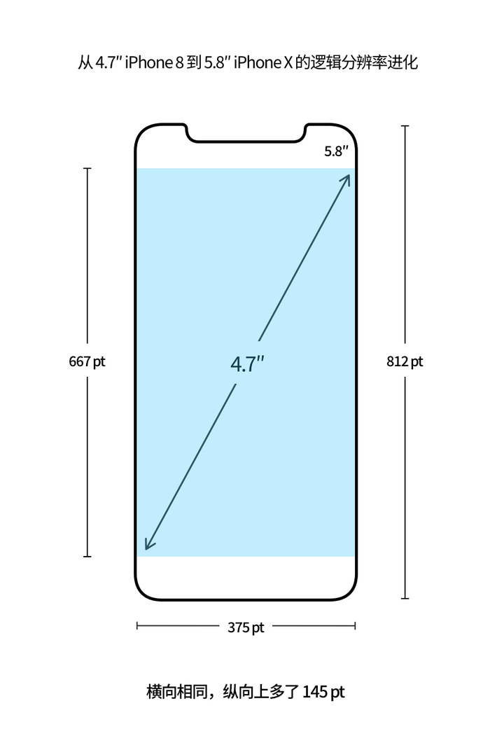 5.8 寸的 iPhone X 的逻辑分辨率为 375×812pt,比例因子为 @3x。逻辑分辨率在横向上是与 4.7 寸的 iPhone 8 的屏幕相同的,在纵向上比 iPhone 8 多了 145 pt,纵向上可以显示更多内容了。所以 iPhone X 的逻辑分辨率实际上是对 iPhone 8 的逻辑分辨率「横向不变,纵向变长」得来的,这与从 iPhone 4s 到 iPhone 5 的屏幕进化方式相同。