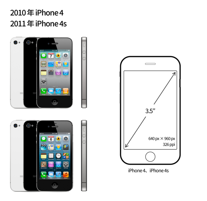 2010 年具有全新硬件设计的 iPhone 4 发布,其屏幕分辨率升级为 640×960px,是前几代 iPhone 的两倍,屏幕尺寸仍然保持 3.5 英寸,PPI 达到了 326。在如此高的像素密度下,人眼已经几乎看不到屏幕上的像素点,因此 Apple 称之为「Retina / 视网膜屏幕」。2011 年发布的 iPhone 4s 与前一代的屏幕分辨率和尺寸保持相同。