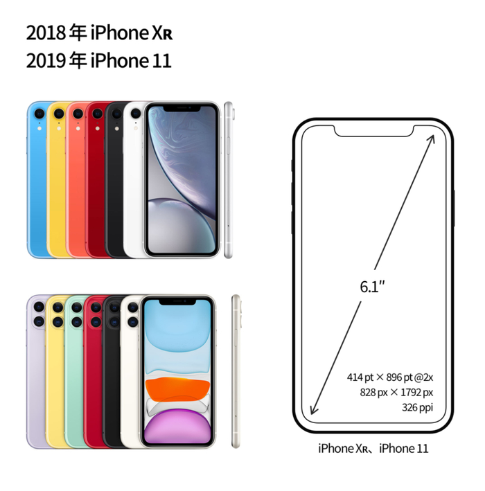 2018 年 Apple 还同时发布了 6.1 寸屏幕的 iPhone XR,屏幕分辨率为 828×1792px,PPI 为 326;2019 年 iPhone XR 的继承者 iPhone 11 发布,与上一代的屏幕保持一致。