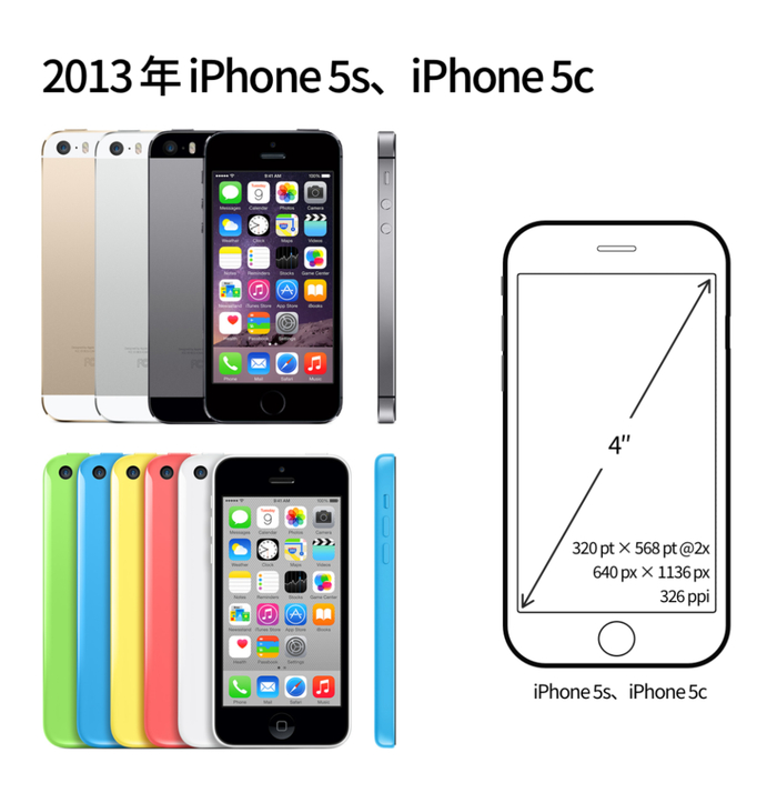2013 年 Apple 发布了相比 iPhone 5 屏幕没有发生变化的 iPhone 5s 和 iPhone 5c,它们的屏幕逻辑分辨率仍然为 320×568pt @2x。同年 Apple 推出了 iOS 7,从此设计风格由拟物化风格转向扁平化风格。