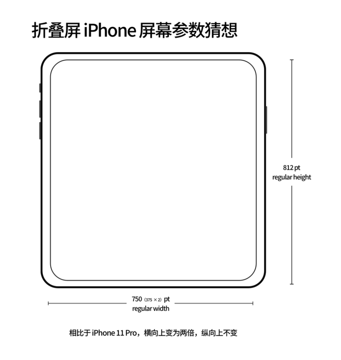 隔壁 Android 阵营已经有多家厂商发布了折叠屏手机,比如三星 Galaxy Fold、华为 Mate X,折叠屏也很可能成为 iPhone 未来发展的一个方向,iPhone 的屏幕很有可能出现第三个进化方法——横向放大,纵向不变。