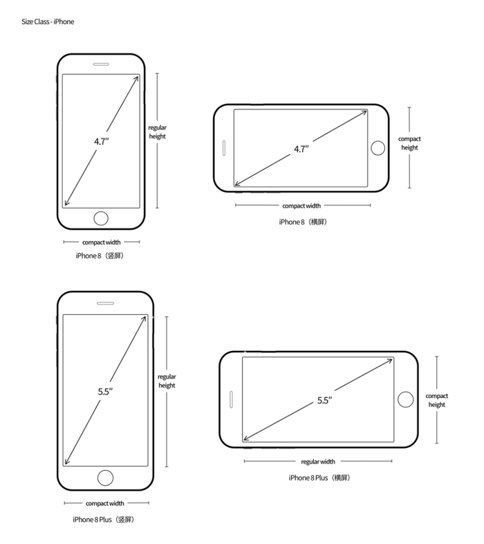 如下图,iPhone 8 在竖屏时的 Size Class 是「compact width,regular height」,在横屏时是「compact width,compact height」;iPhone 8 Plus 在竖屏时是「compact width,regular height」,在横屏时是「regular width,compact height」,与 iPhone 8 并不相同,因为 iPhone 8 Plus 屏幕尺寸更大。