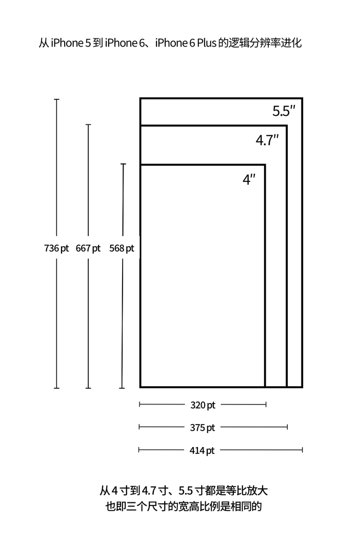 这是历史上 iPhone 屏幕尺寸的第二次重大变化,但与之前的 4 寸 iPhone 5s 仔细对比观察,你会发现新的 4.7 寸和 5.5 寸的屏幕与以前的 4 寸屏幕宽高比例是相同的,所以可以理解成 4 寸的屏幕分别「等比放大」了约 1.17 倍和 1.29 倍,变成了现在的 4.7 寸和 5.5 寸屏幕。屏幕逻辑分辨率在宽度和高度上的增加,可以让屏幕上一次性展示更多内容,减少用户滚动屏幕的频率。