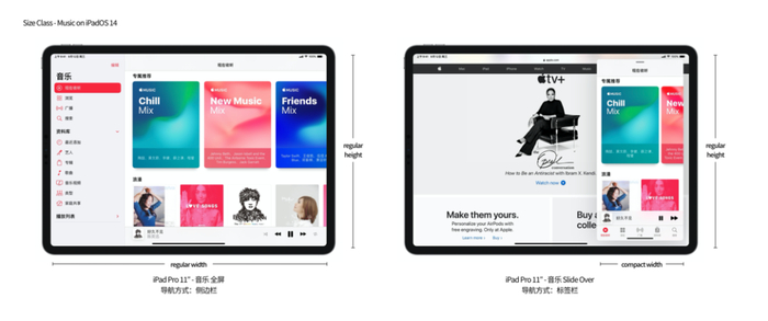 但由于侧边栏占据了较大的显示面积,所以侧边栏不适合内容显示区域较小的情景。例如下图中的「音乐」app,在 iPad Pro 11 寸上全屏展示时,此时 Size Class 为「regular width,regular height」,app 使用侧边栏作为导航方式;当「音乐」app 以 Slide Over 形式运行时,此时 Size Class 为「compact width,regular height」,横向上显示空间有限,所以 app 改用以前的标签栏作为导航方式。