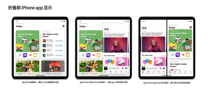 一方面,app 在设计内容布局时使用了 Auto Layout、Size Class、Safe Area 这些武器,app 的布局适应性更高;另一方面更多的 iPad app 已经可以以任何尺寸自适应布局灵活显示,固定尺寸大小的 app 设计思想正在被弱化,同时 app 多任务、多窗口的功能已在 iPadOS 中进化得逐步完善。基于这两方面,到折叠屏 iPhone 推出时,iOS 和 iPadOS 上的 app 适配的阵痛期就会更短。