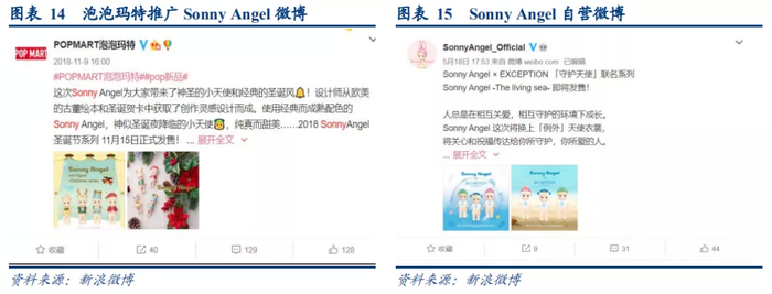 但因当时Sonny Angel国内的售卖渠道较为杂乱,质量不一,包括自动贩卖机、city super、朴坊(生活用品集合店)等,线上线下兼具,加上Sonny Angel在度过热度顶峰(2014-2017年)之后逐渐迎来了销量下滑,IP生命周期逐渐走向后期,热度逐渐褪去。而泡泡玛特已通过售卖Sonny Angel 完成了前期公司粉丝群积累和知名度提升,为集中资源做好公司现有IP和发展自有IP,双方合作终止。2018年11月后泡泡玛特下架Sonny Angel系列,之后Sonny Angel热度明显下降,同样是微博发售新品宣传,Sonny Angel转评赞数量较泡泡玛特渠道下滑明显,不及原来1/3。综上可见,Sonny Angel与泡泡玛特终止合作后,尽管仍有IP知名度,但发展明显受限。