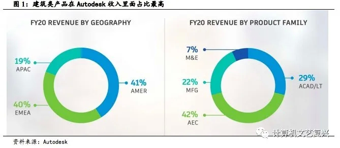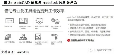当前,Autodesk主力产品线可以分为四大类:AEC,AutoCAD,Manufacturing,Media and Entertainment。Autodesk中国区网站上可以售卖的软件包括61款(包括组合),我们对其中主力产品的主要功能以及订阅费做了梳理。当前四大类产品的收入占比分别为:42%:29%:22%:7%。